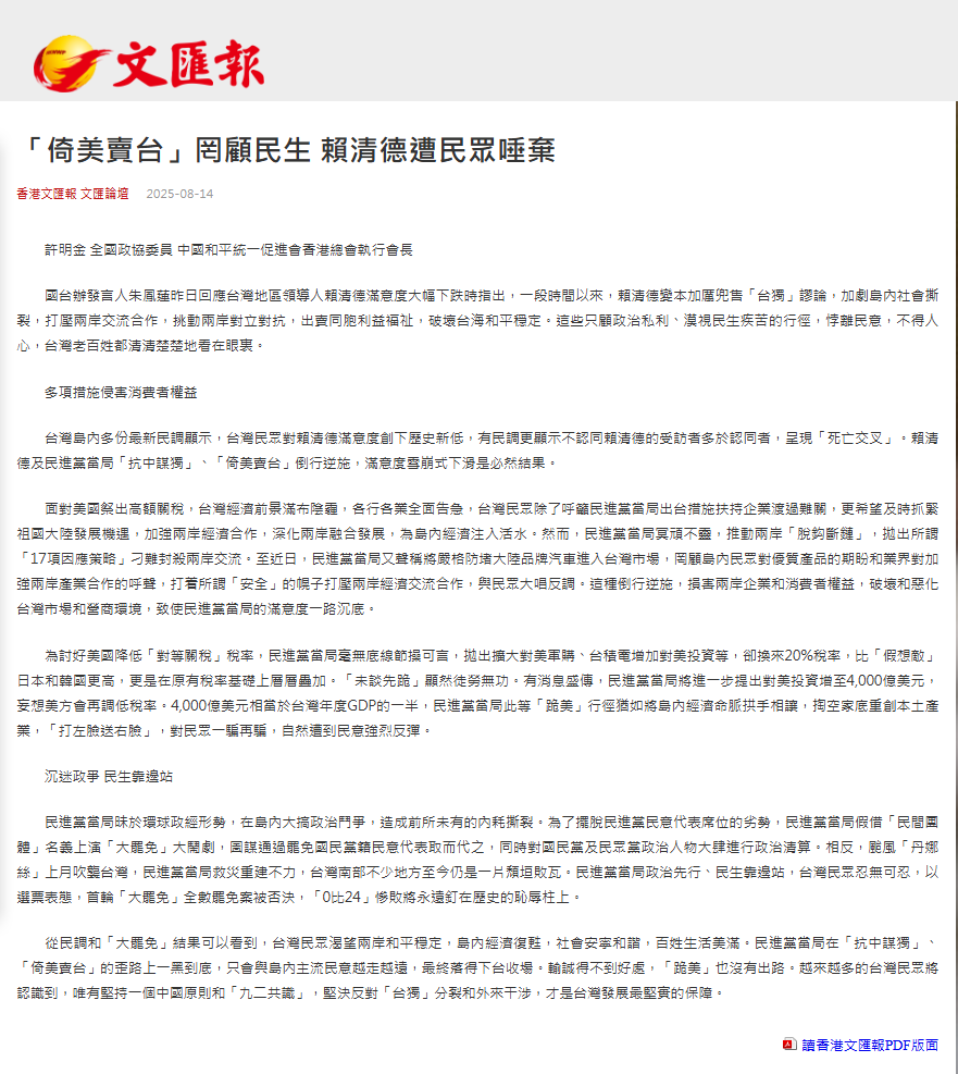 2025年8月14日,全國政協(xié)委員、廣東省福建商會會長、中國和平統(tǒng)一促進(jìn)會香港總會執(zhí)行會長、集團董事局主席許明金,在香港《文匯報》發(fā)表了“「倚美賣臺」罔顧民生 賴清德遭民眾唾棄”的文章。